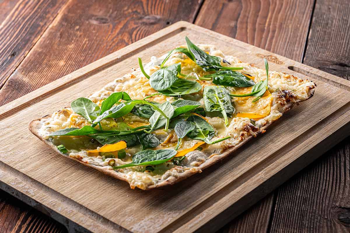 Backen und Servieren: Den Flammkuchen auf dem Pizzastein 2,5-4 Minuten backen. Nach dem Backen den Babyspinat auf dem Flammkuchen verteilen. Mahlzeit!