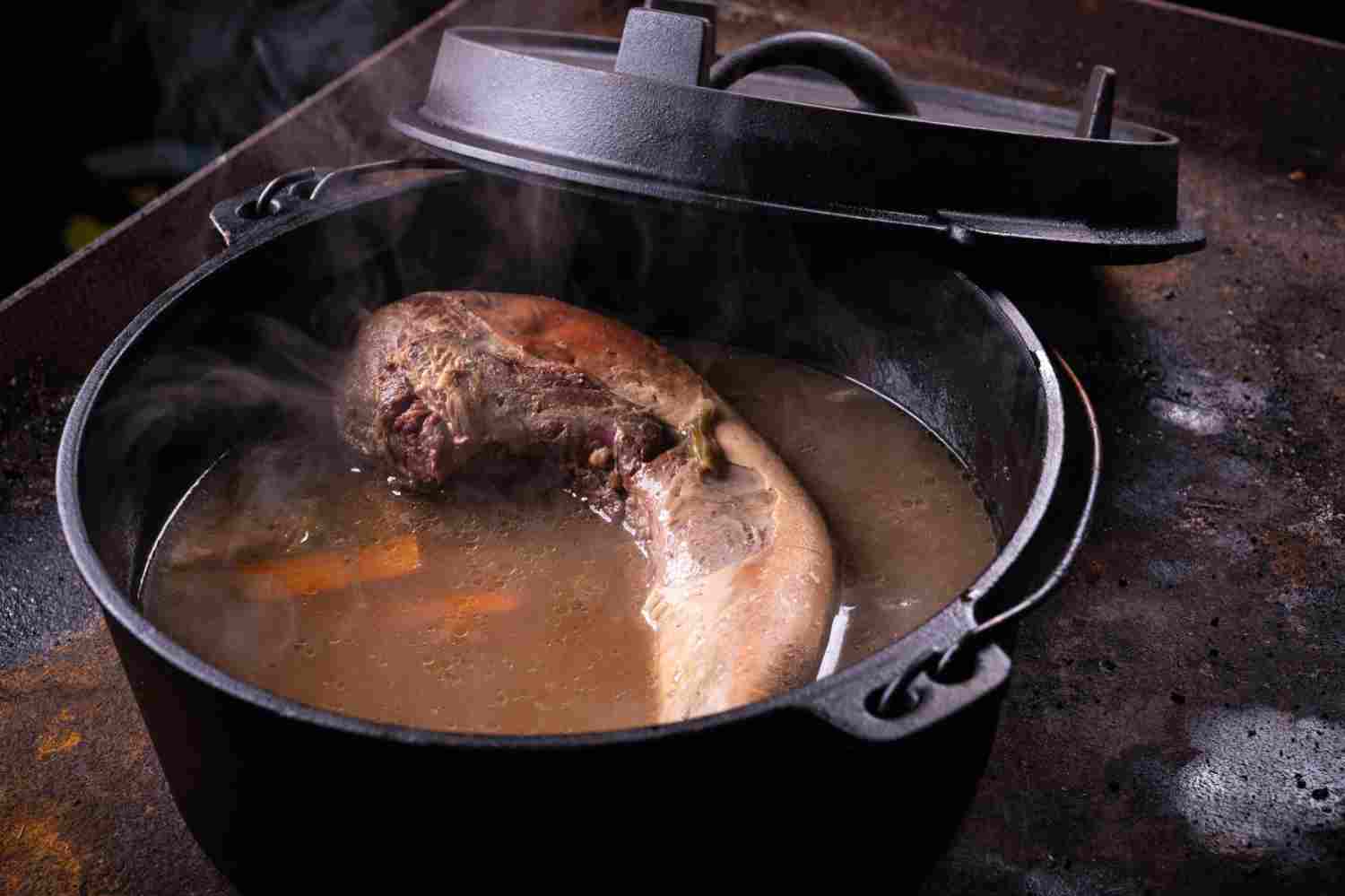 Das Kochwasser im Dutch Oven erhitzen, danach alle Zutaten und die Rinderzunge zugeben. Den Deckel schließen und die Zunge solange köcheln lassen bis sie wirklich weichgekocht ist, am besten prüft man dies beim Einstechen mit einer Fleischgabel (ca. 3-4 Stunden).