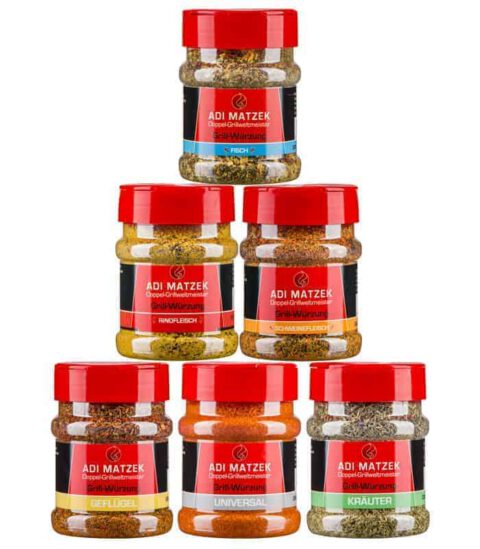 Die Adi Matzek Grill-Würzungen sind eine Serie ausgereifter und ausgewogener Kräuter- u. Gewürzmischungen die den Eigengeschmack der Grillprodukte unterstreichen. Das Set beinhaltet je eine Dose Schweinefleisch-, Rindfleisch-, Geflügel-, Fisch-, Kräuter- und Universal-Würzung. Als Gratisbeigabe wird eine zusätzliche Dose Universal-Würzung beigepackt.